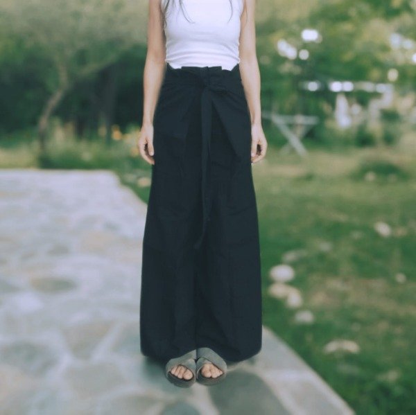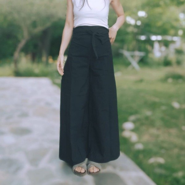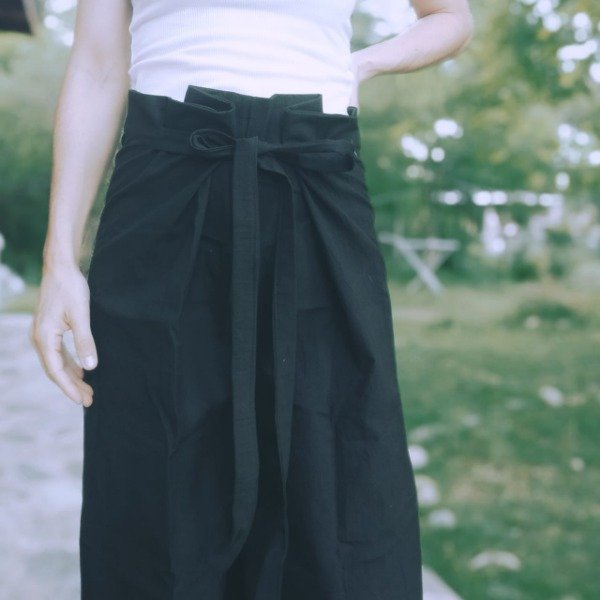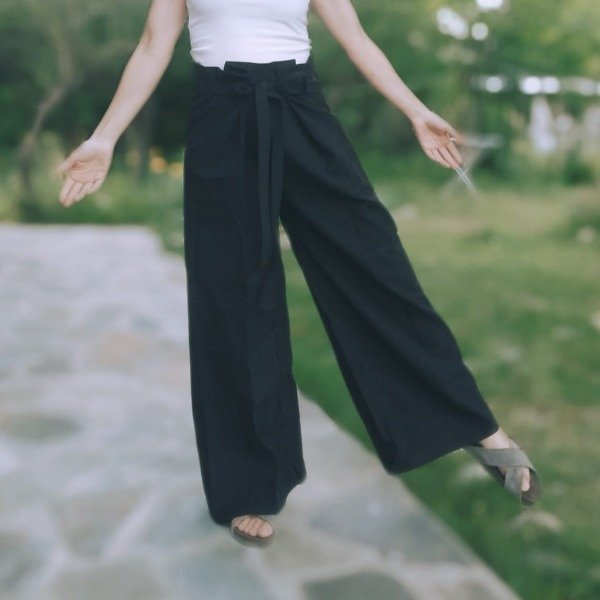 Es un pantalón ancho, de tiro medio-alto que se ata por dentro y delante; se pliega a los laterales tomando la medida del cuerpo. Podes atarlo hacia adelante o hacia atras.